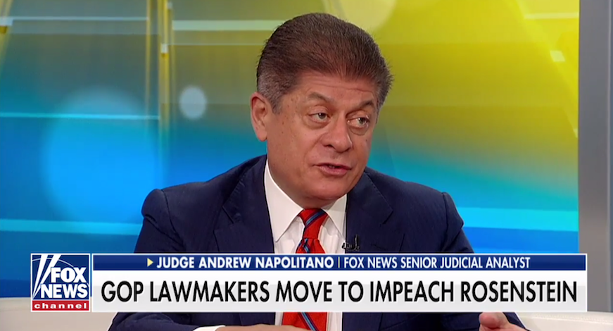 Although Trump lickspittles Sean Hannity, Jeanine Pirro and Lou Dobbs have long pushed for the impeachment of Deputy Attorney General Rod Rosenstein, Fox’s senior judicial analyst Andrew Napolitano called out the articles of impeachment as a stupid political stunt.